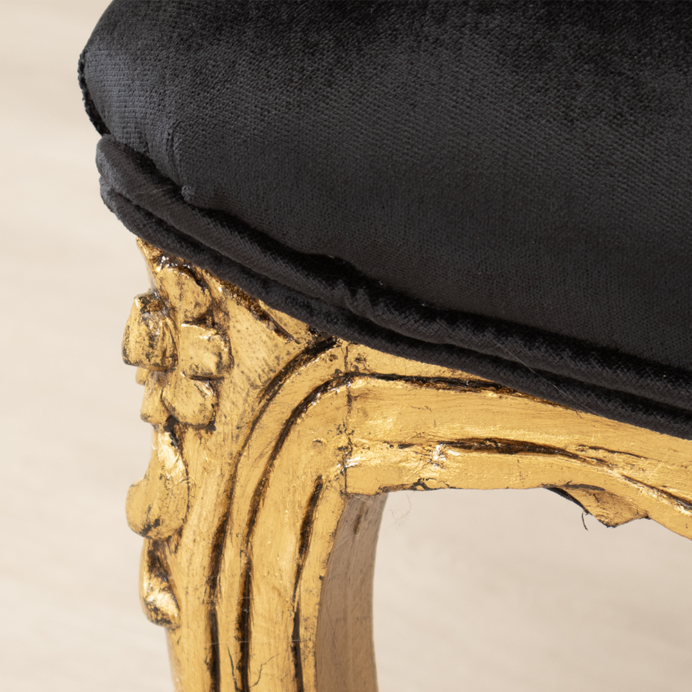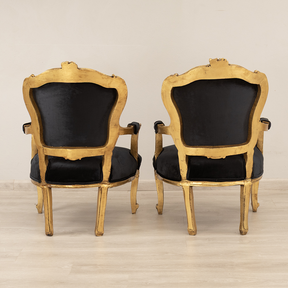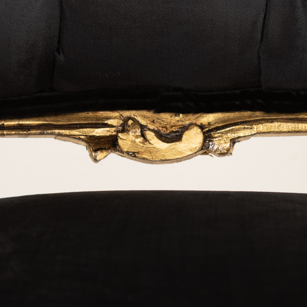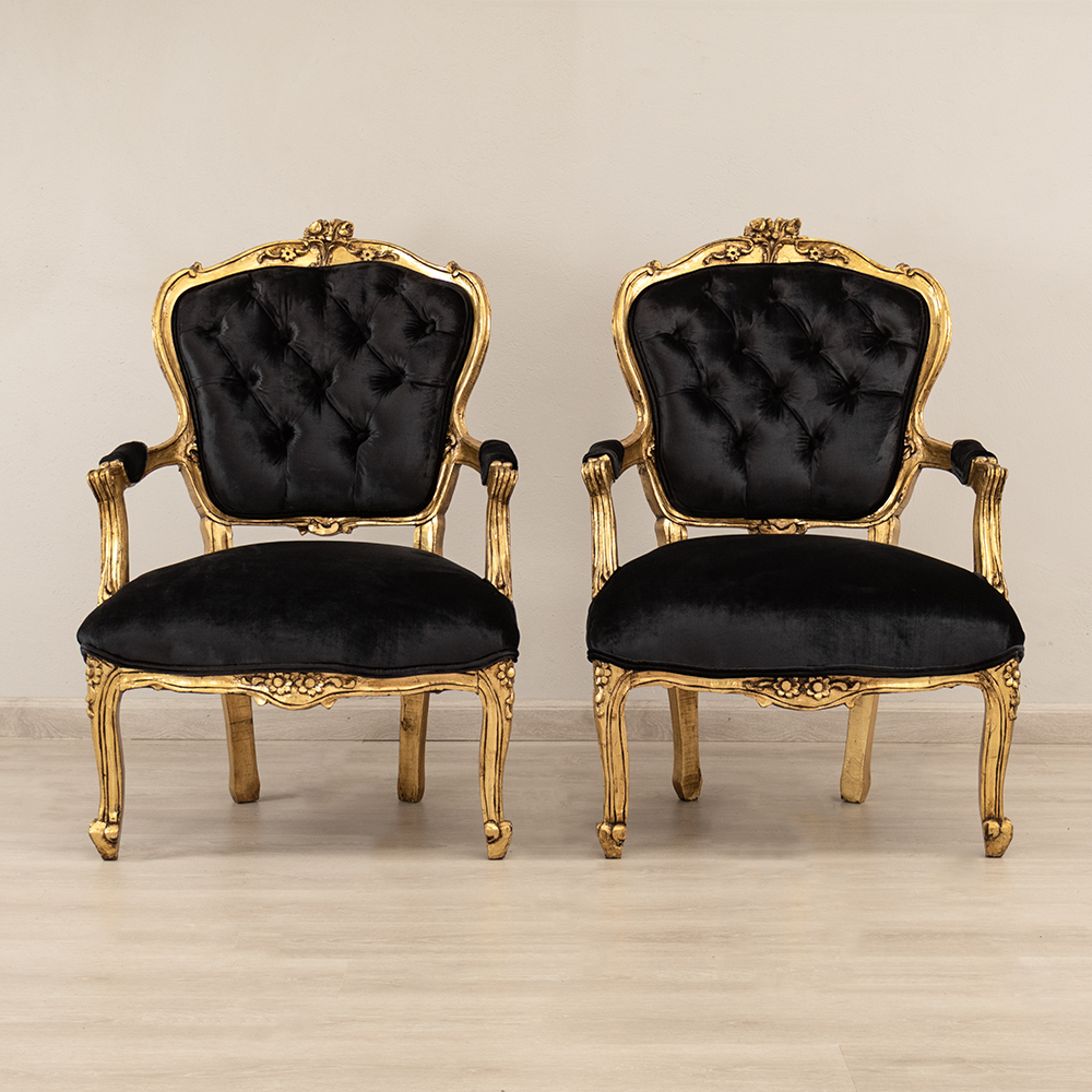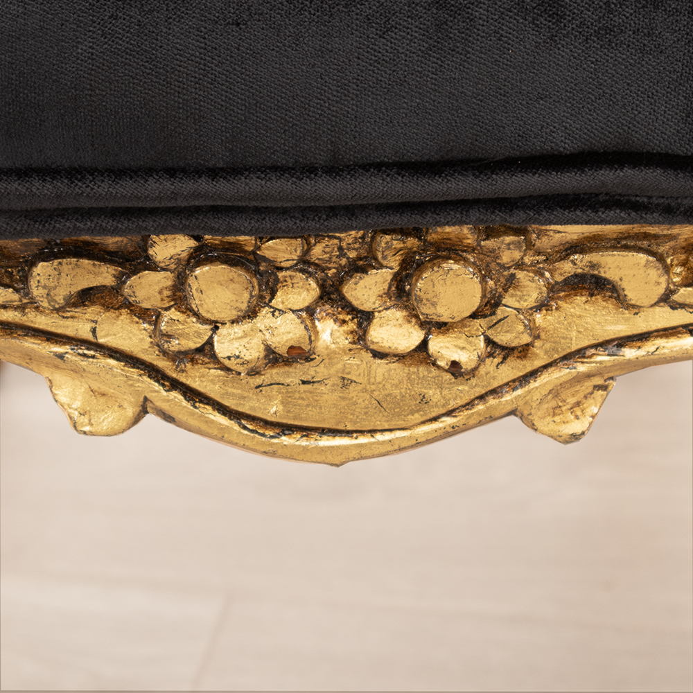 Elevate your space with this exquisite pair of refurbished French-style Black & Gold Armchairs, masterfully restored to showcase their opulent charm. Featuring intricately carved wooden frames finished in radiant gold gilding, these chairs embody the lavish spirit of Rococo design. The rich black velvet upholstery adds a dramatic contrast, offering both comfort and sophistication.