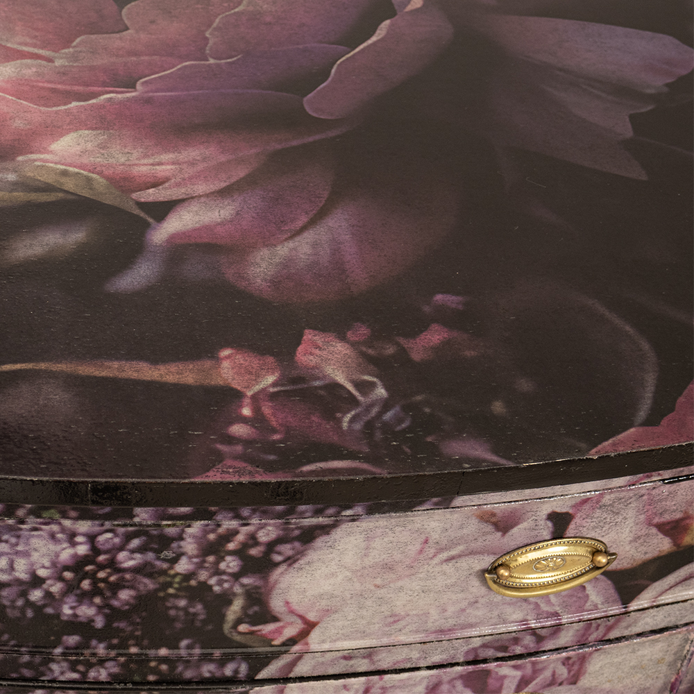 Two central drawers feature elegant brass handles and keyholes, adding a touch of old-world sophistication. The warm metallic tones play beautifully against the cooler floral palette, enhancing the cabinet’s vintage appeal.