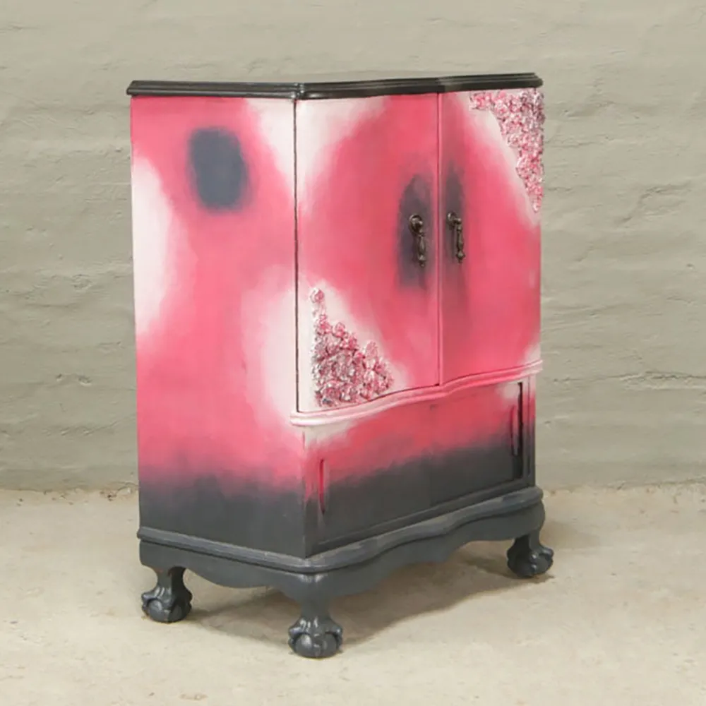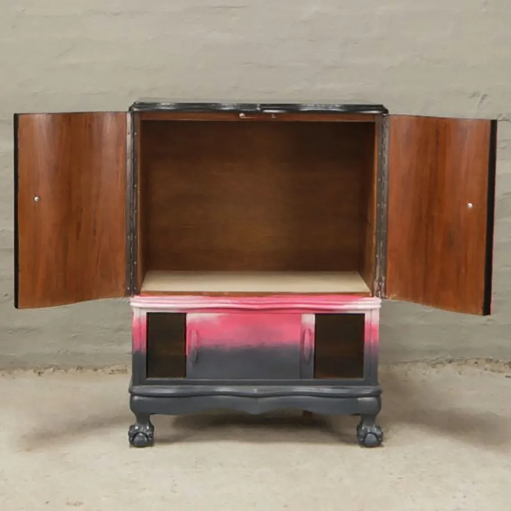 Go funky, arty and unique with this Display Imbuia Cabinet. Painted in pink and dark grey ombre, decorated with floral embellishments. A natural dark top, and resting on ball and claw feet. Featuring two swinging doors with brass handles and two smaller sliding doors below for storage and display.