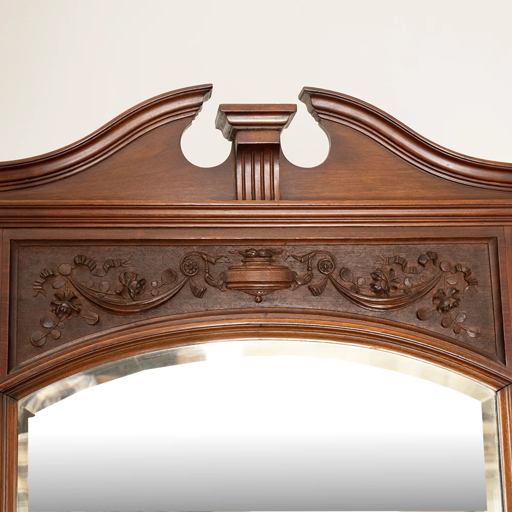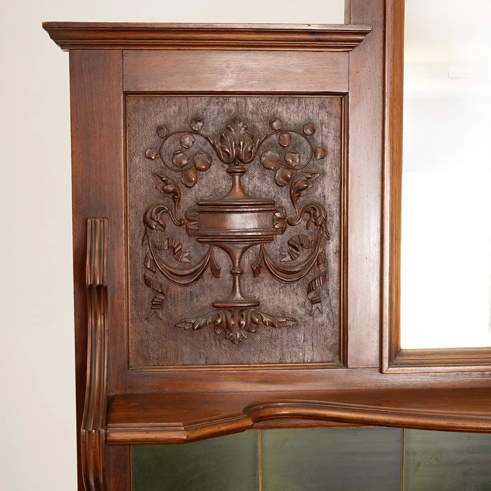 Upper section: mirror flanked by carved panels, each featuring a flowering urn motif