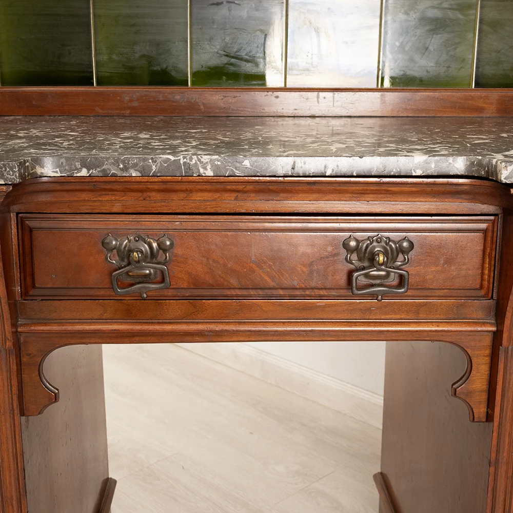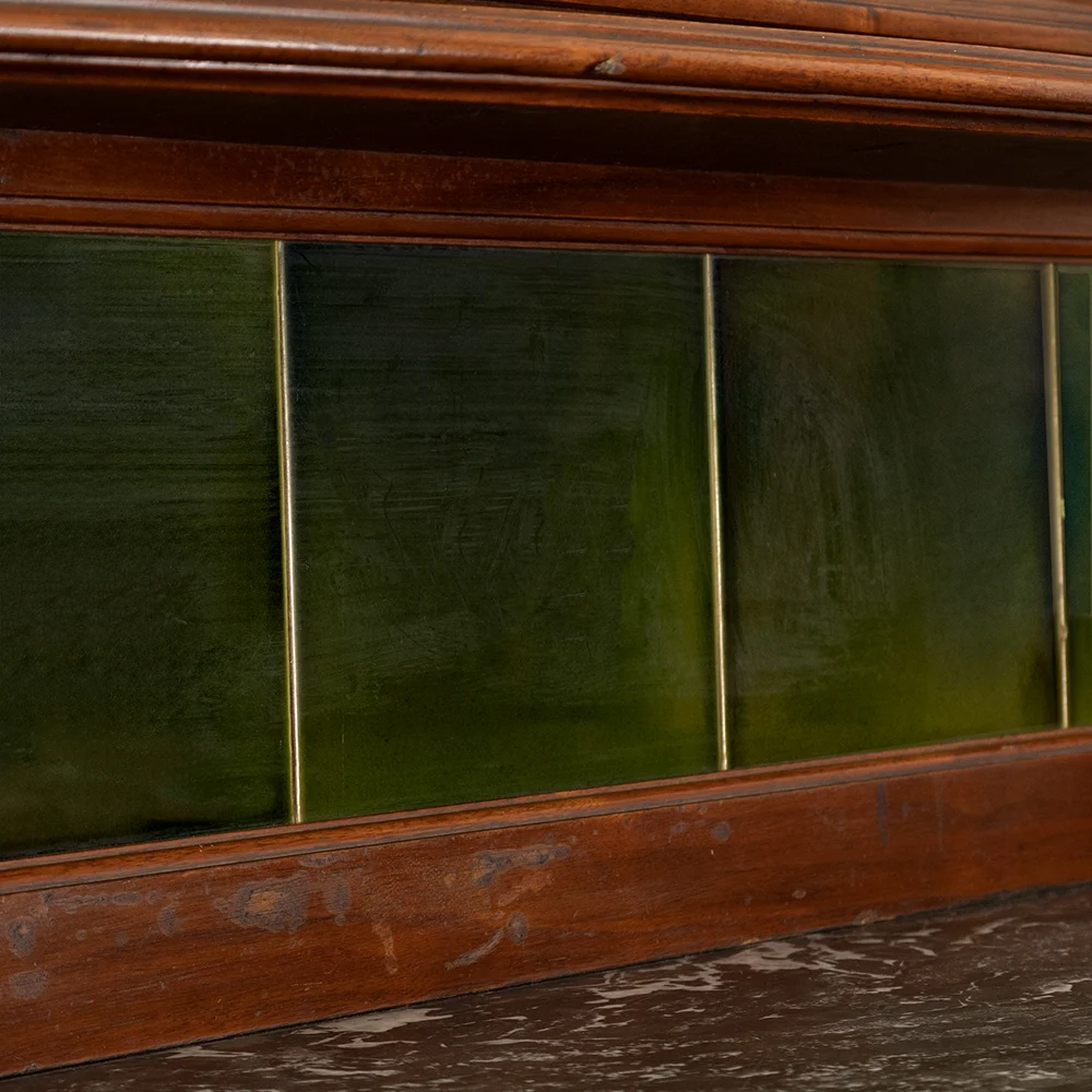 The tile section is a striking feature that elevates the entire sideboard. Those green ceramic tiles framed within the backsplash add both texture and color contrast to the dark mahogany and marble. They serve a dual purpose: