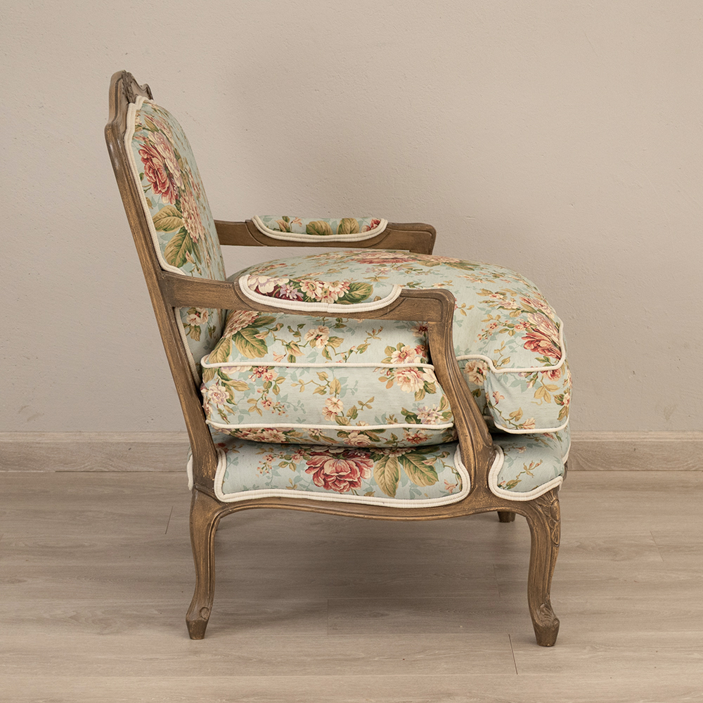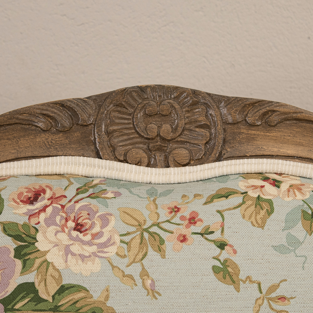Fabric: Upholstered in a luxurious, beautifully Rose and floral pattern on a soft pastel blue back ground that enhances its romantic charm.