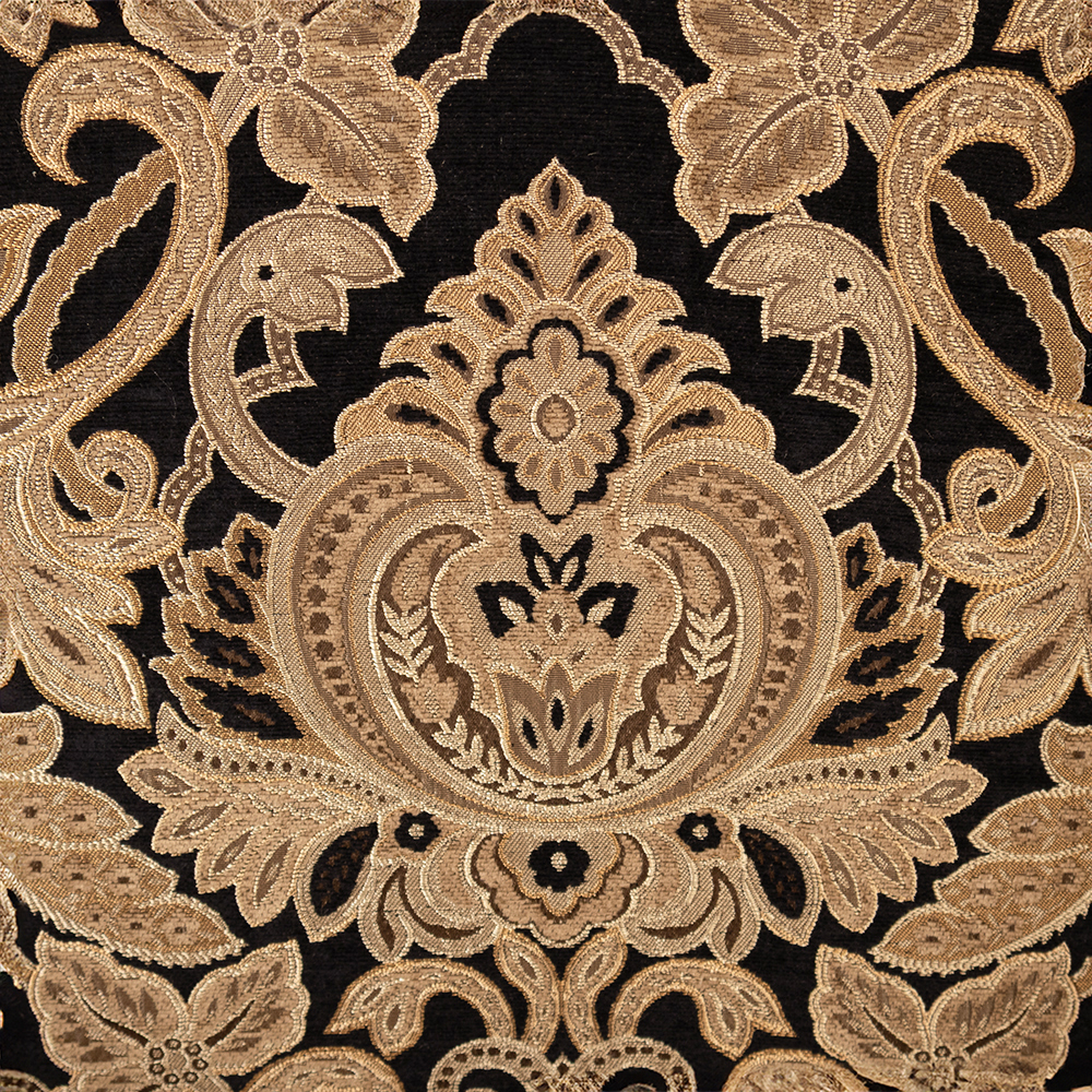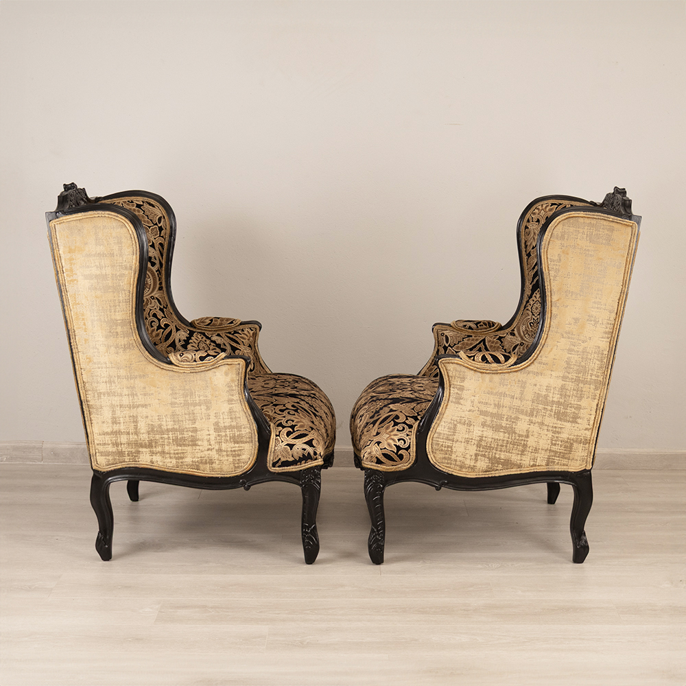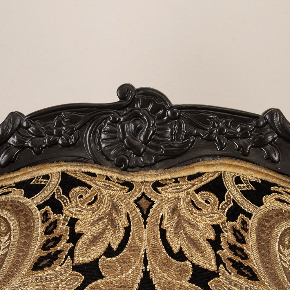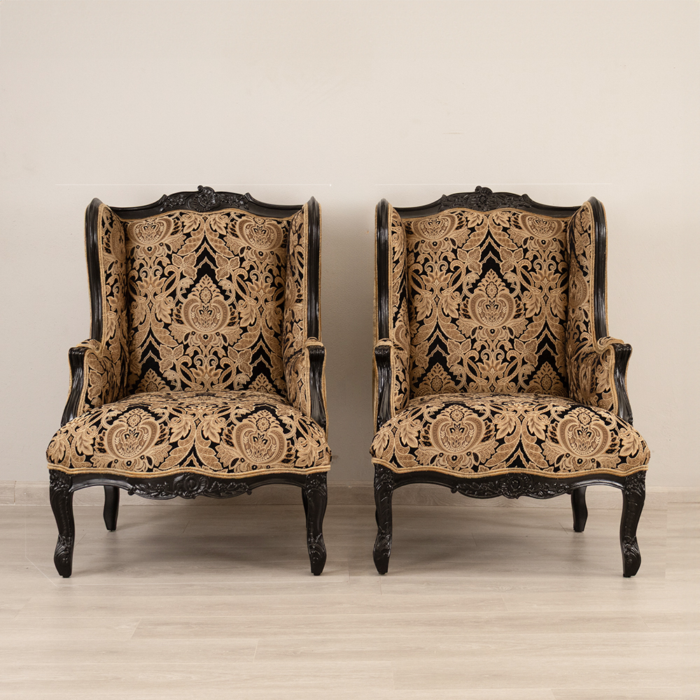 This pair of refurbished Victorian wingback chairs commands attention. Their stately frames—carved in deep black matte wood—trace the ornate curves and flourishes of 19th-century design, where every scroll and crest spoke of artistry and aspiration. Upholstered in a gold and black damask embossed fabric, they shimmer with quiet opulence, like candlelight on velvet.