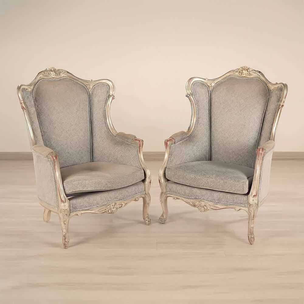 This pair of French Louis XV‑style fauteuil wingback armchairs brings refined elegance and timeless craftsmanship to any interior. Crafted in the late 20th century, the silver‑gilt wooden frames feature an aged finish with subtle red oxide undertones beneath the paint, creating depth and character. The shell‑carved detailing on the backrest and apron, combined with the wingback silhouette, makes these chairs both decorative and comfortable.