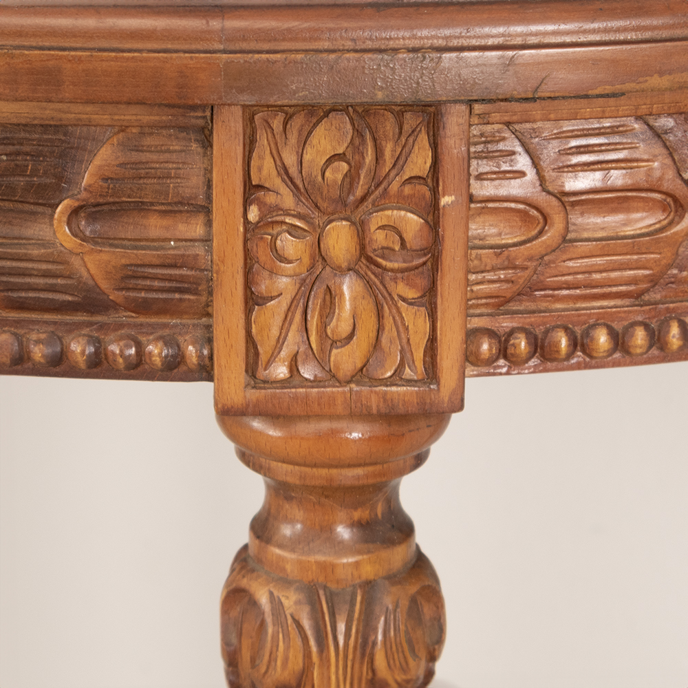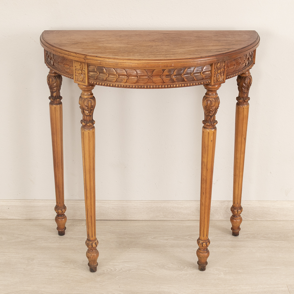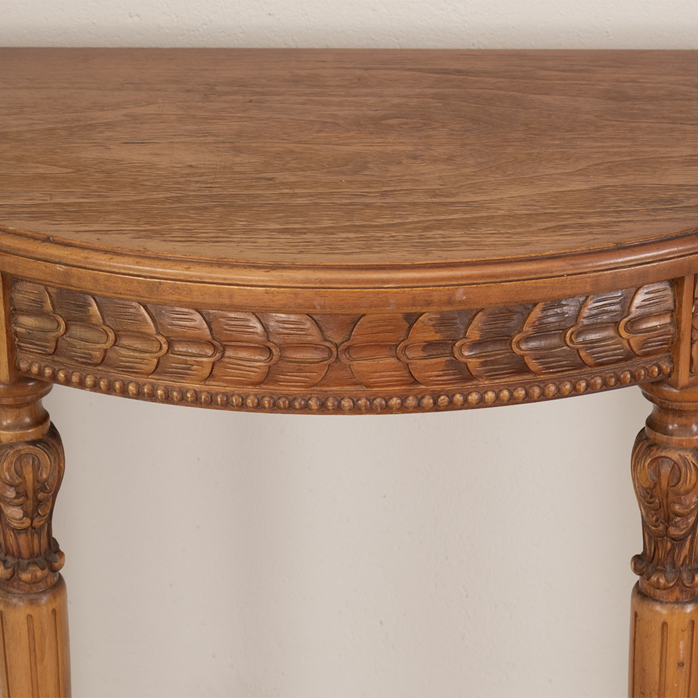 Elevate your interior with this vintage half-moon console table, featuring intricate carvings and a graceful semi-circular silhouette. Crafted from walnut wood, its warm natural finish enhances the grain and highlights the detailed craftsmanship throughout the apron and turned legs.