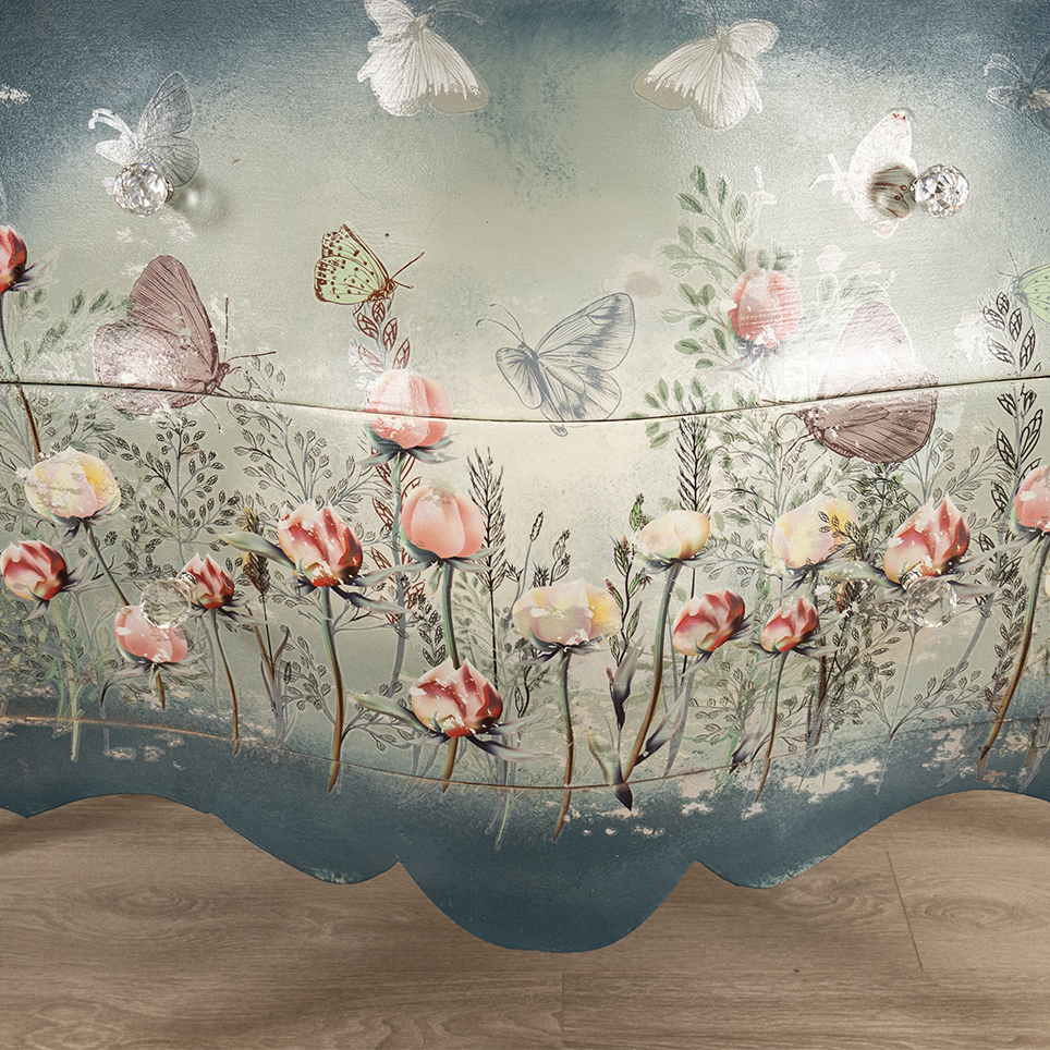 The front of the chest showcases a stunning floral transfer design, featuring delicate roses in bloom surrounded by wildflowers and graceful butterflies fluttering across the surface. The artwork brings the feel of a romantic garden scenery, making this chest both functional and decorative.