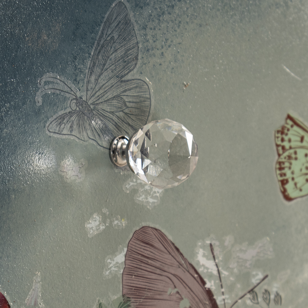 Two spacious drawers with crystal knobs. A one-of-a-kind creation that will bring charm, sophistication, and a touch of nature’s beauty into your home.
