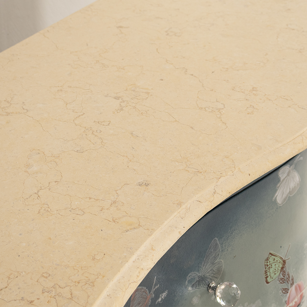 This exquisite bombe chest is a true statement piece, blending timeless elegance with artistic charm. The body is beautifully finished with a blended paint technique in soft gradient tones, creating depth and sophistication. Its smooth marble top adds luxury and practicality, perfect for styling or everyday use.