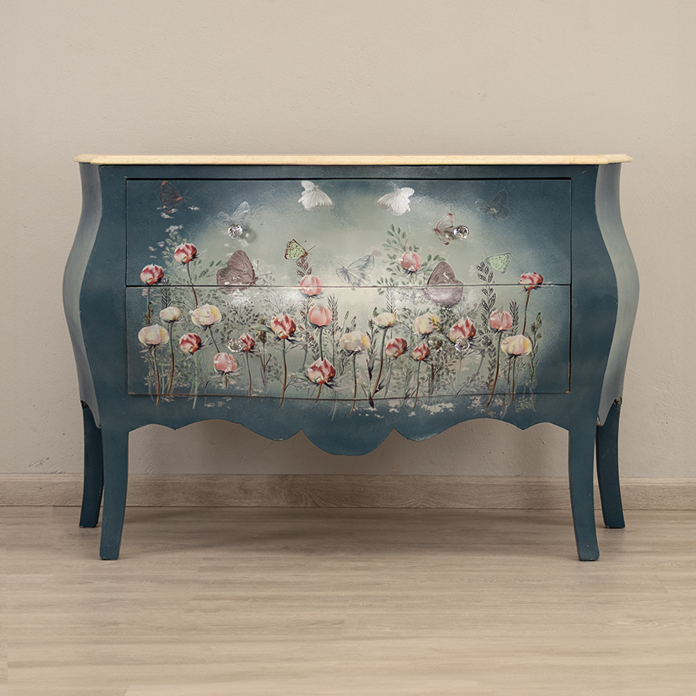 Elegant Marble Top Bombe Chest – Hand-Painted with Butterfly & Rose Garden Design