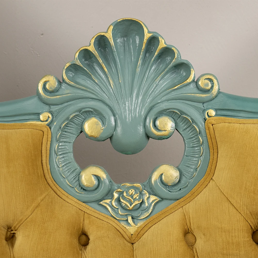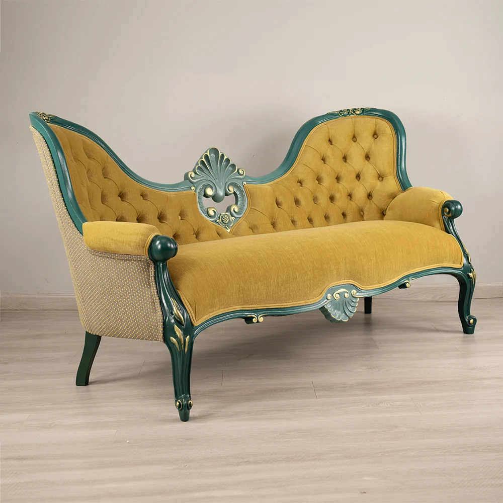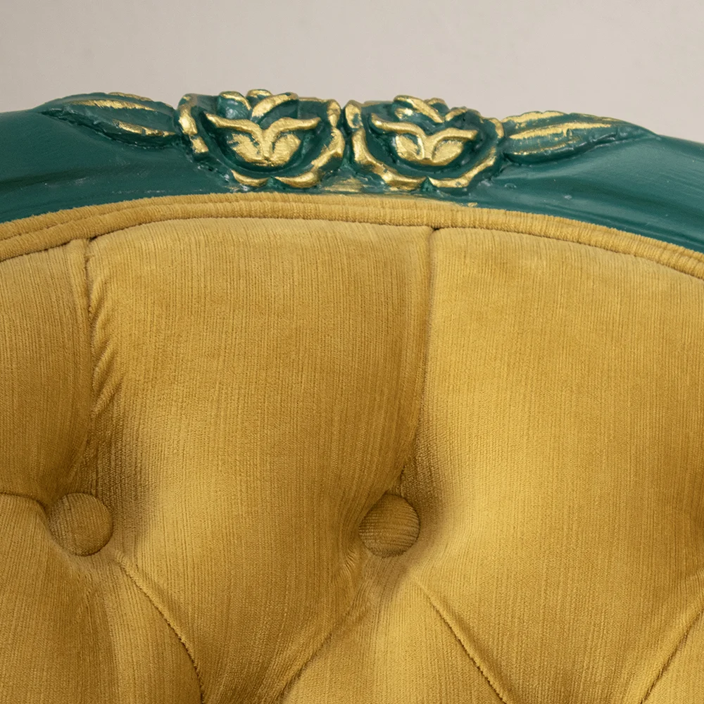 Make a bold statement with this exquisite 3‑seater settee, a masterpiece of French Revival style. Featuring a unique ombre finish from emerald green to light blue, the frame is accented with gilded highlights that emphasize its ornate carvings and flowing silhouette. Upholstered in luxurious gold/sulphur velvet, the seat and backrest are richly tufted, while the grey back panel with yellow dotted detailing adds a contemporary twist to its classical elegance.