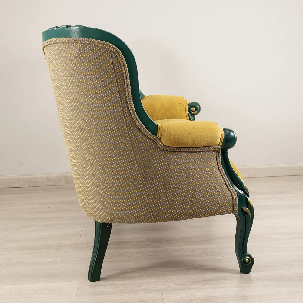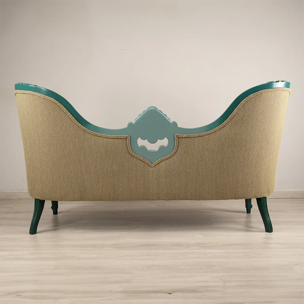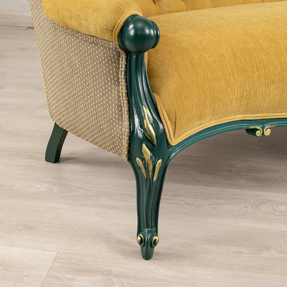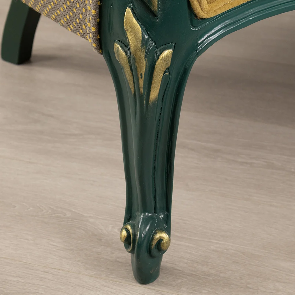 Make a bold statement with this exquisite 3‑seater settee, a masterpiece of French Revival style. Featuring a unique ombre finish from emerald green to light blue, the frame is accented with gilded highlights that emphasize its ornate carvings and flowing silhouette. Upholstered in luxurious gold/sulphur velvet, the seat and backrest are richly tufted, while the grey back panel with yellow dotted detailing adds a contemporary twist to its classical elegance.