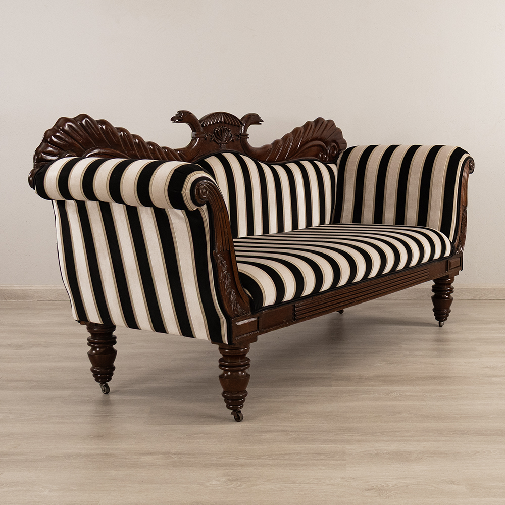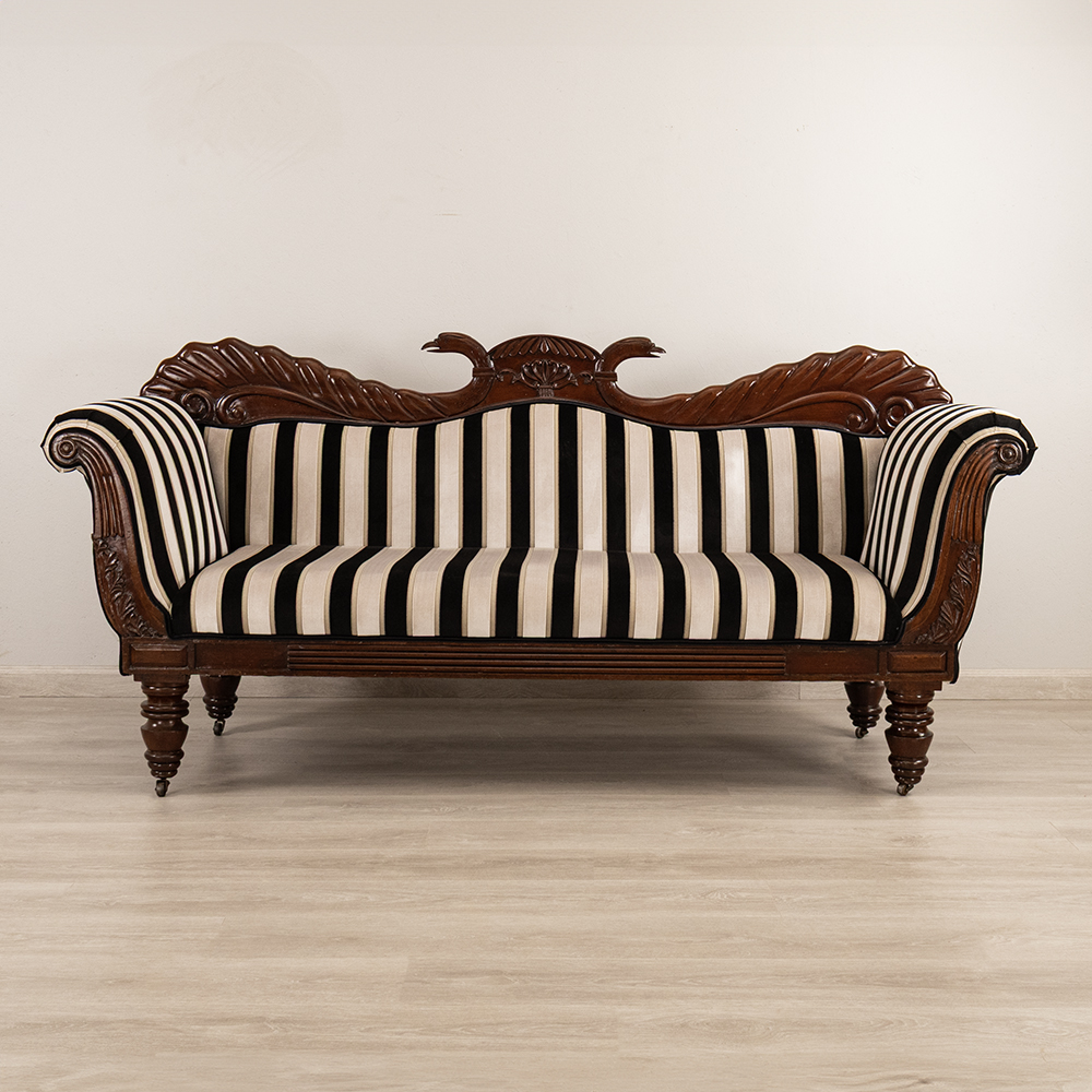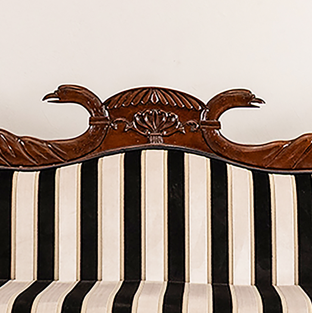 Rare Mahogany Regency Sofa / Circa 1920 / Swan Carved Antique with Oyster & Black Stripe Upholstery
