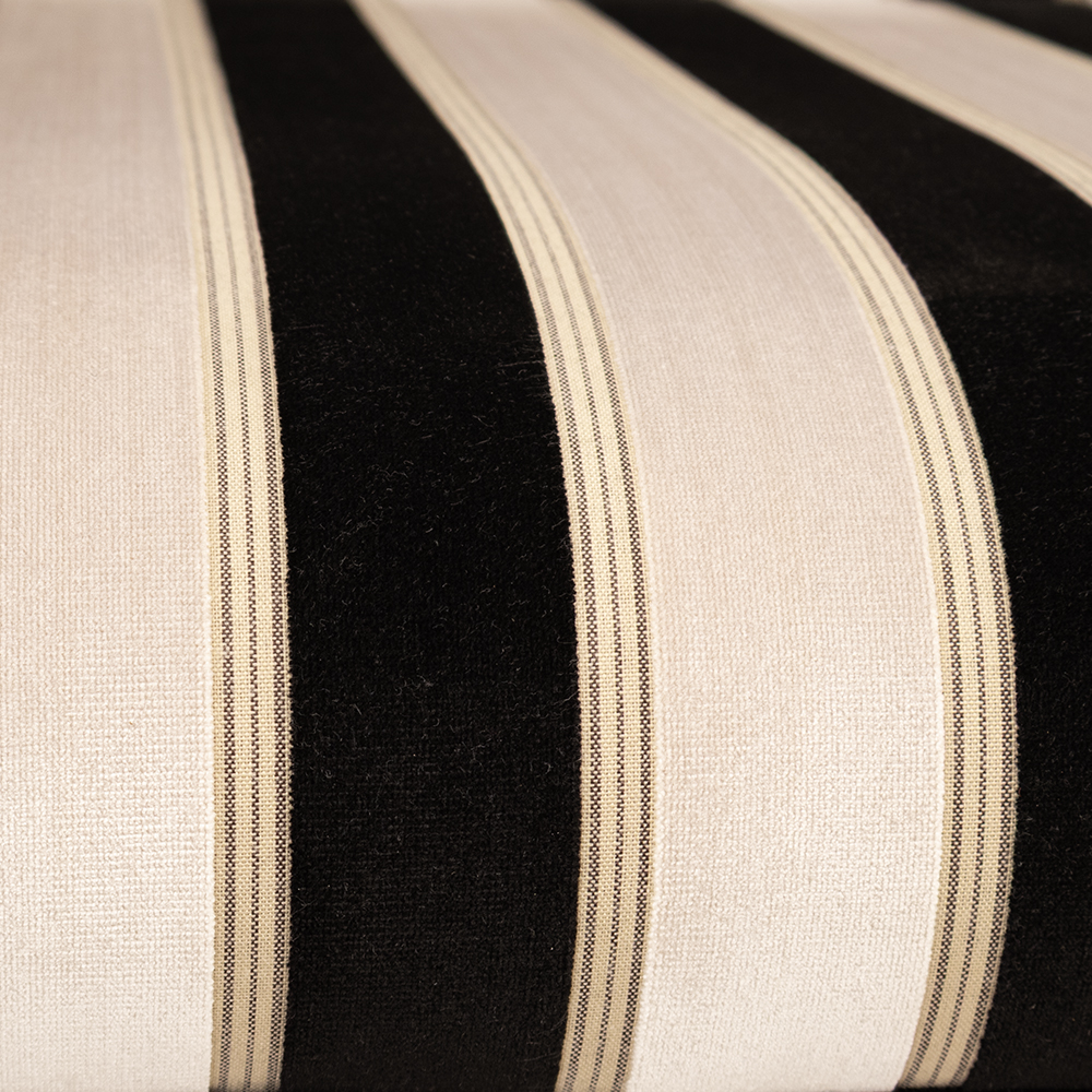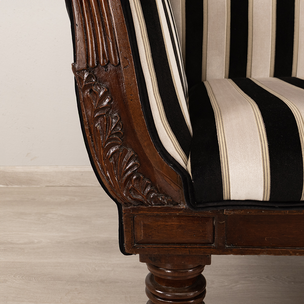* Reupholstered in oyster and black striped fabric, the bold vertical lines lend drama and sophistication, while the neutral palette ensures versatility across design styles—from romantic maximalism to tailored minimalism.