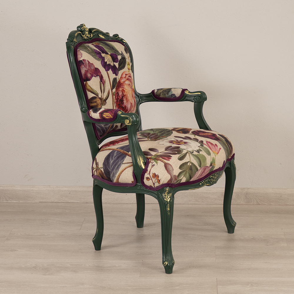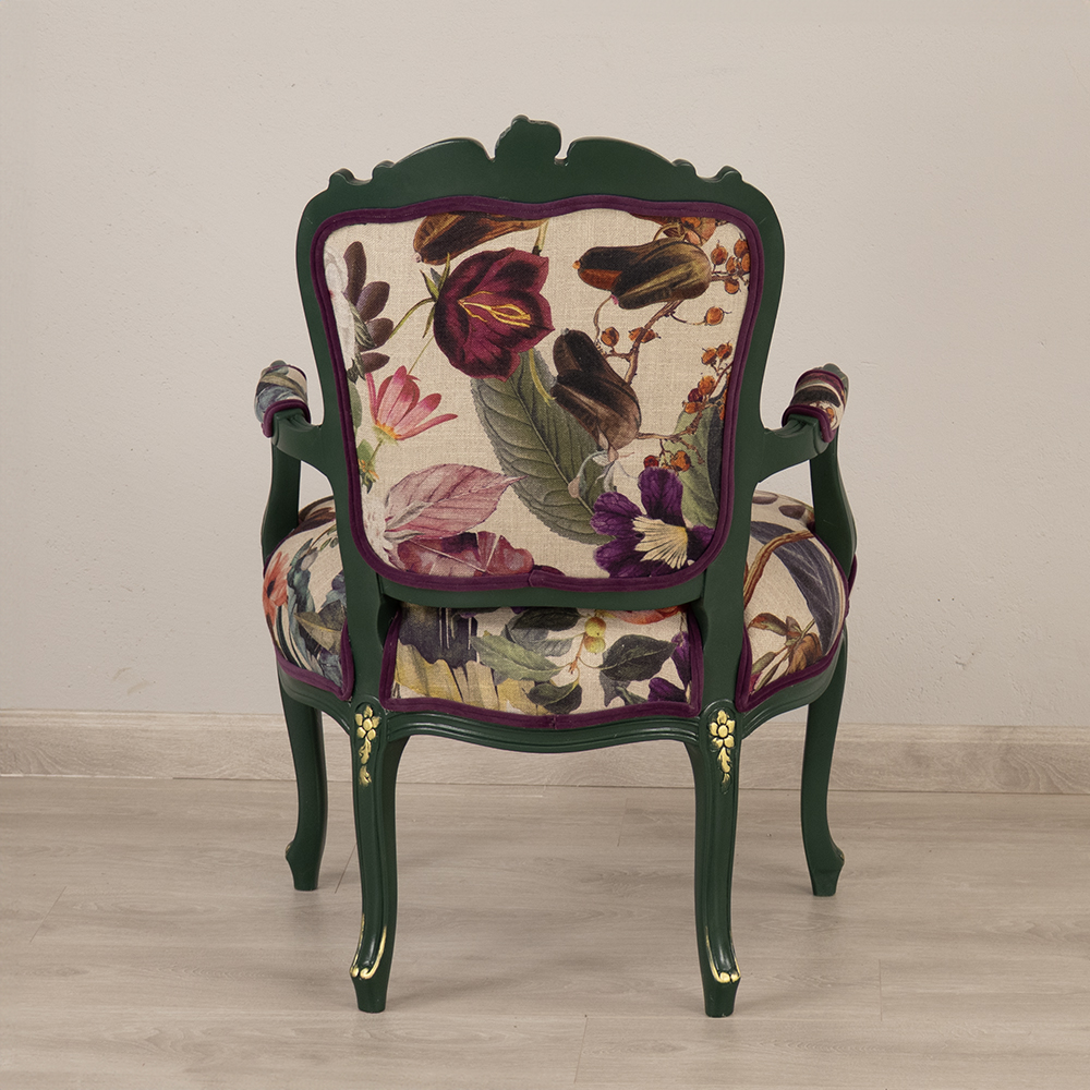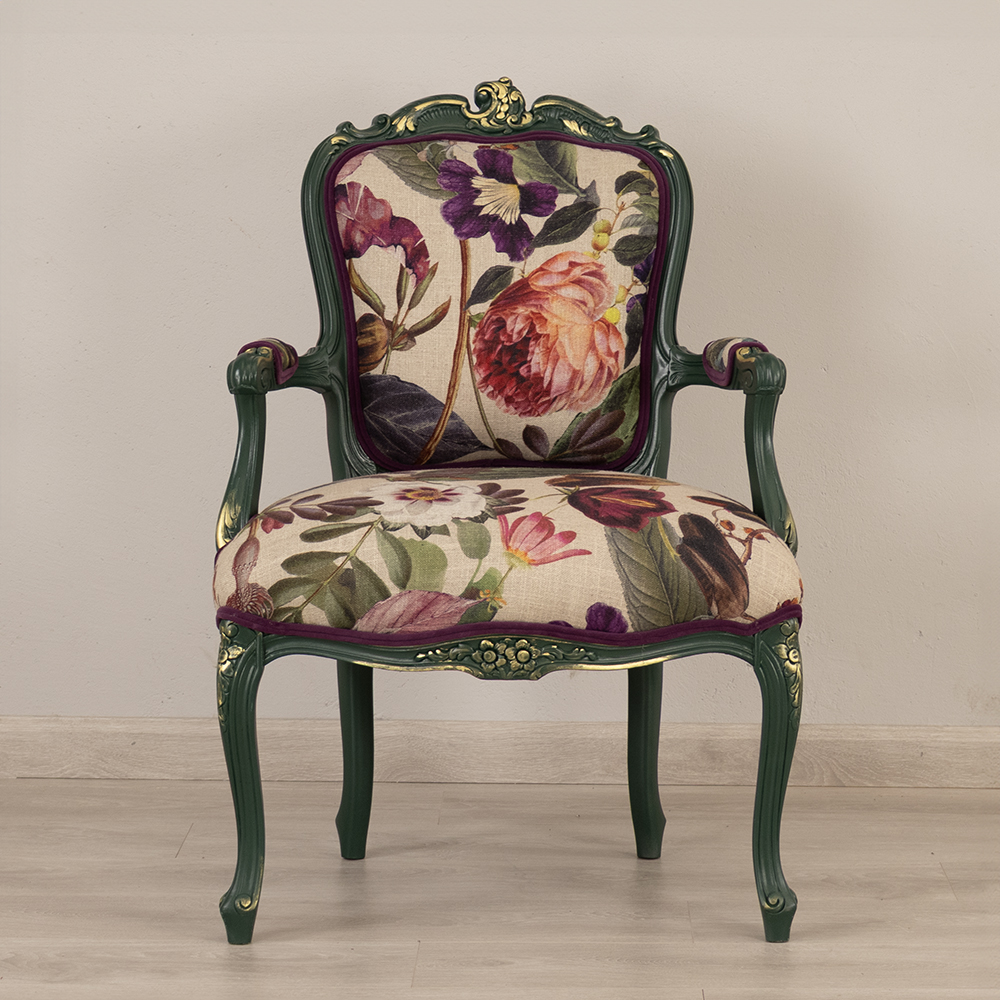 • Upholstery: Luxuriously re-covered in Hertex floral fabric, offering both durability and romantic appeal