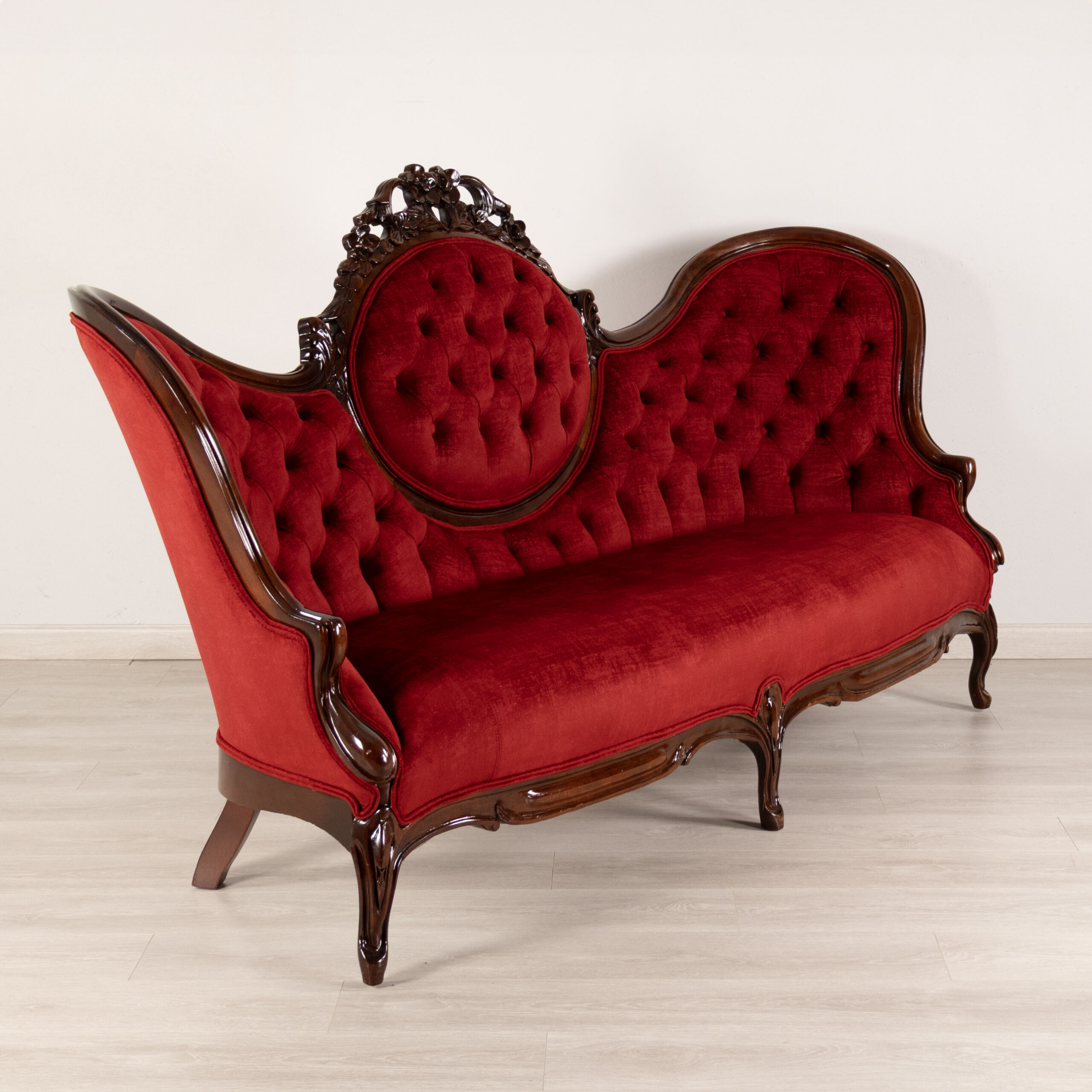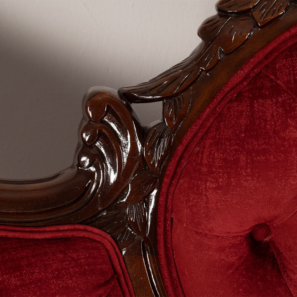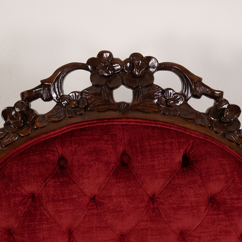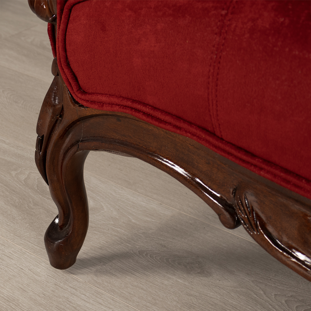 Step into a world of opulence with this beautifully restored Victorian-style settee, upholstered in luscious scarlet velvet and finished with deep diamond button tufting that invites both admiration and comfort.