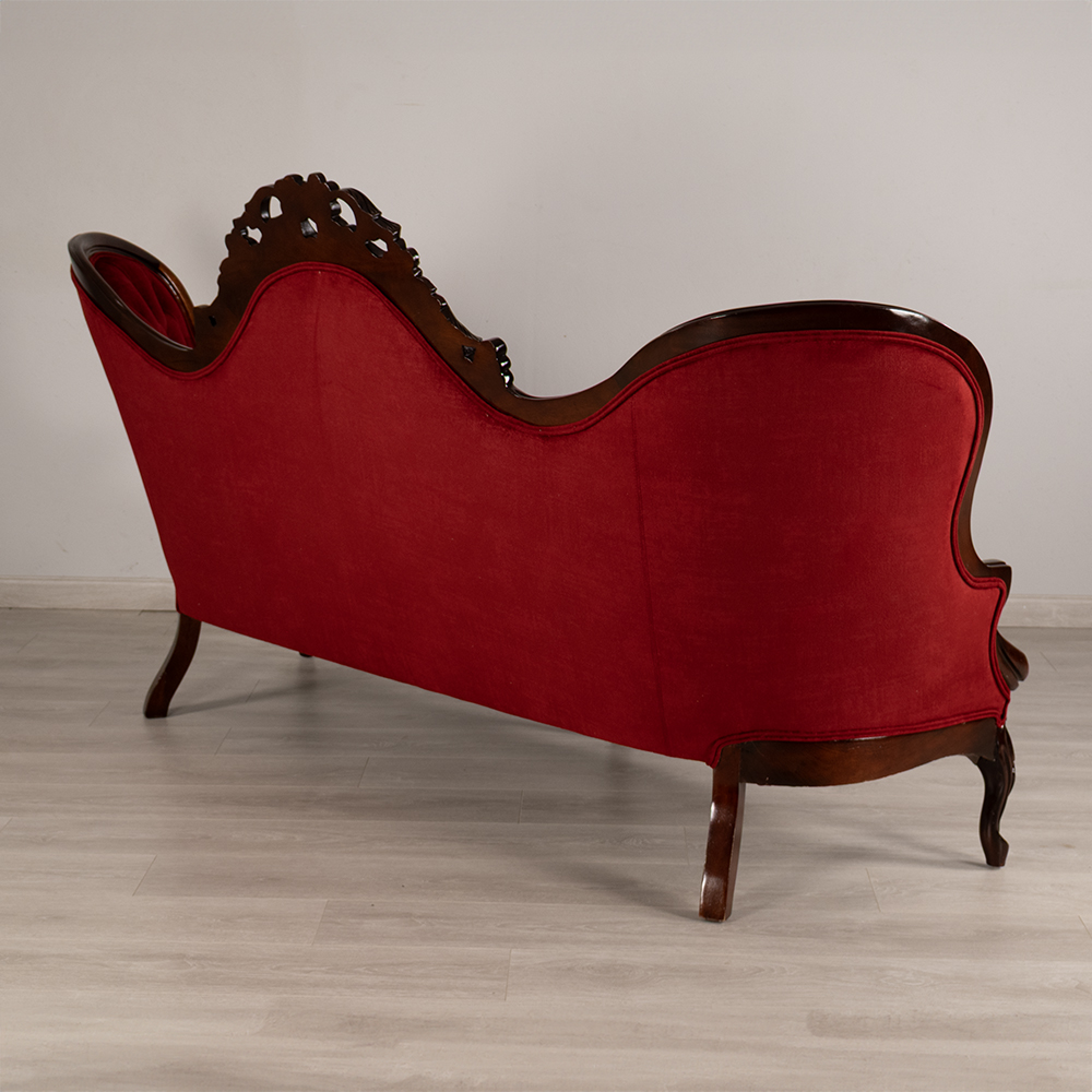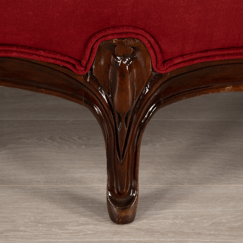 The settee’s cabriole legs curve gracefully in classic S-shapes, ending in delicately carved feet that elevate the piece with timeless sophistication. These legs not only reflect the elegance of 19th-century design but also provide sturdy support for modern use.