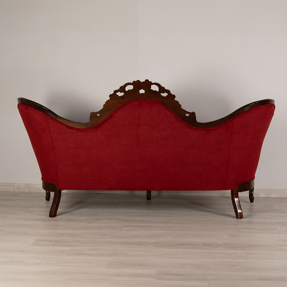 Restored Victorian Large Settee in Scarlet Velvet – Ornate Carved Backrest & Cabriole Legs